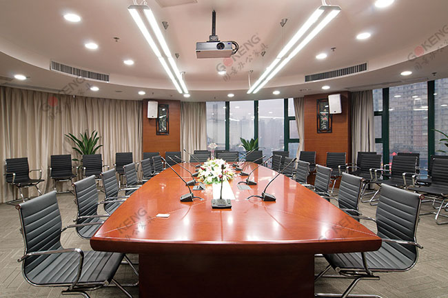 上图为广西北海市合浦县人民医院大会议室。会议桌采用高密度纤维板制作,油漆7分光面工艺。主体桌子可容纳14人进行会议。而会议椅用的是比较常规的一款弓字型会议椅。椅脚,扶手采用304不锈钢弯曲成型。连接处用上等精品螺丝固定。坐垫和靠背采用连体式细皮工艺制作,不锈钢椅脚再加细皮工艺的坐垫和靠背,让整张会议椅都彰显出会议椅该有的风范。