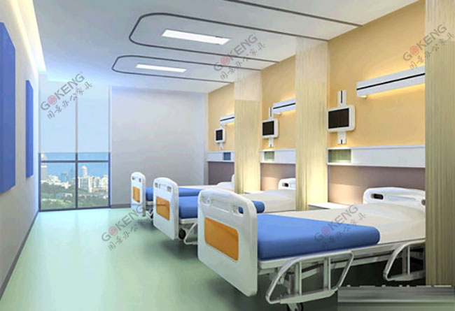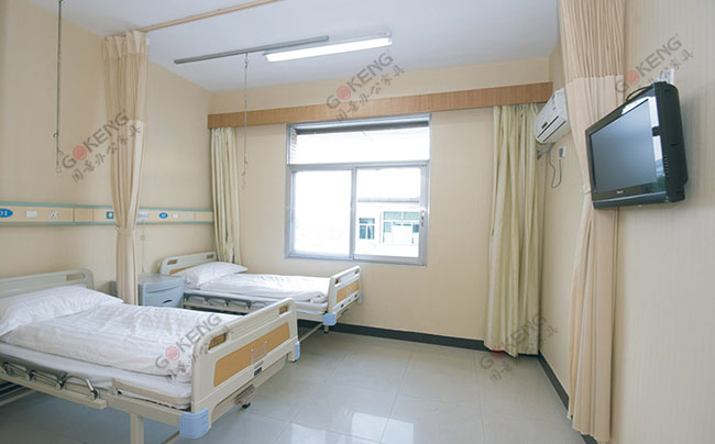 上图为广西北海市合浦县人民医院普通病房,病床采用铁架床架和塑胶床位结合工艺制作。再加上一个定型棉床垫,构成一张普通病房的病床。同时,为方便病人放置各种东西,每个床配备了一个铁皮三抽床头柜,能更好的让病人家属放置各种东西。