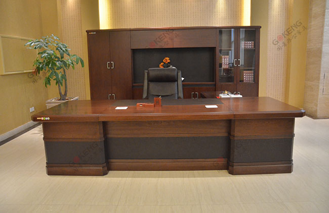 上图为广西北海市合浦县人民医院领导办公室,大班台采用的是实木贴皮大班台,带左副柜。班台台脚采用三截式拼接工艺生产,而上下的细皮设计和台脚的凹凸线条设计,让整个办公班台层次感瞬间提升。桌面采用一体式台面,左右对称有两个过线孔,方便装电脑使用。靠近办公人员的地方采用西皮贴附于班台,提升其办公人员的工作舒适感。再配上一把真皮大班椅就更加突显这套办公家具的豪华之气了。后面有点中国风的文件柜也是这套办公家具的亮点。之所以数文件柜带有中国风色彩,因其拉手设计确实是采用的中国风设计。