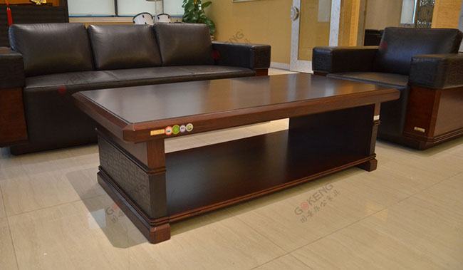 上图为广西北海市合浦县人民医院领导办公室接待区的沙发和茶几。同样,茶几的设计也是非常有层次感,台脚中部用的细皮贴附与台脚上。瞬间提升整个茶几的档次。同时,用的是与沙发同样的皮质,能更好的形成衬托。沙发组合采用的是3+1+1的组合形式,采用的是皮木结合工艺,沙发脚擦用实木贴皮工艺。坐垫和靠背用的是西皮分离式衔接工艺。