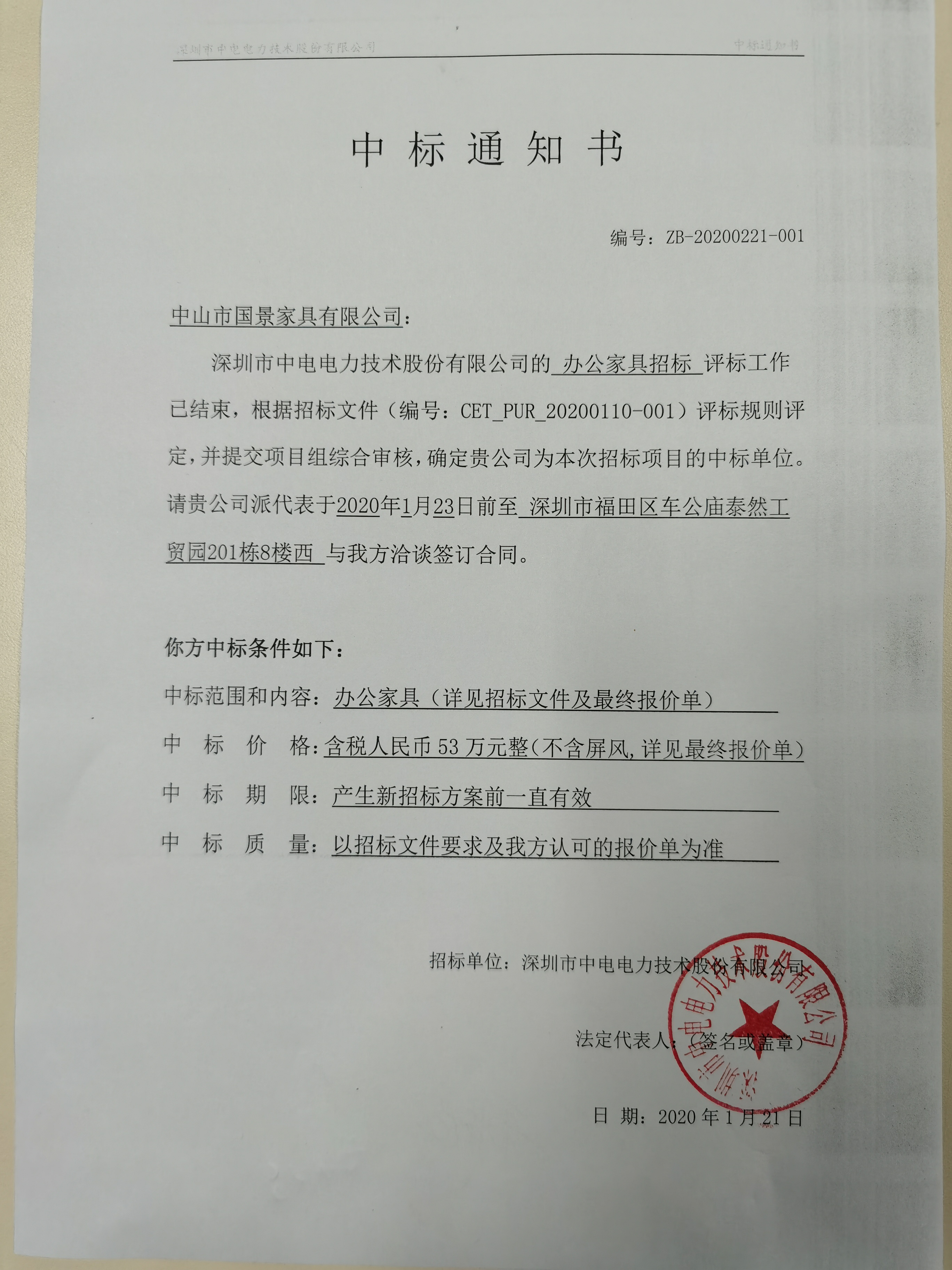 喜中深圳市中电电力股份有限公司办公家具招标工程项目。感谢中电电力股份有限公司对国景办公家具的信任,此外,国景家具一定不负贵司厚望,一定在规定期限内保质保量的把贵司交给我们的任务完成。在此,国景家具再次感谢深圳市中电电力股份有限公司的信任。